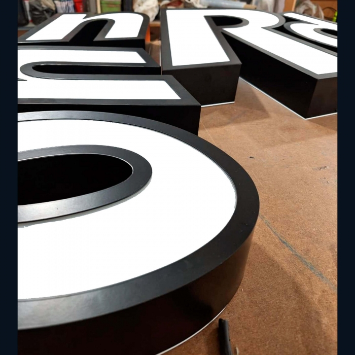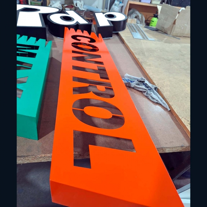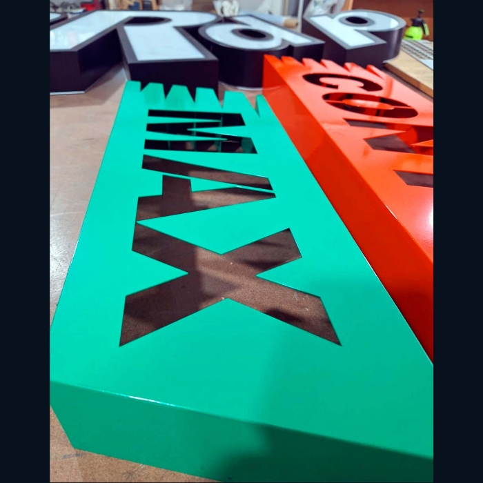 Letrero de chapa pintada epoxi horneada. Frente de acrílico transiluminado. Iluminación leds MACROLEDS 5050 IP 45.